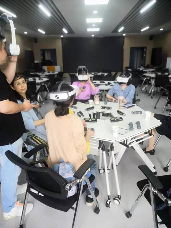 会后,黄院长带领两院的马原组教师体验了我院的生命长江虚拟仿真教学体验中心。徐骆给老师们介绍了3D大屏游览红色景点和VR一体式头盔开展思政主题应用的交互体验。随后,老师们体验了《VR长征史诗》中的“爬雪山”“过草地”等场景。并就马原课程与VR相结合的途径和前景进行了讨论。