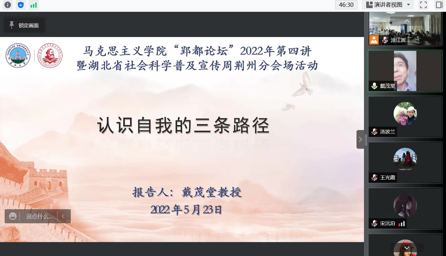 (通讯员 马梦甜)知人者智,知己者明。2022年5月23日上午9点整,北京师范大学哲学国际中心教授戴茂堂为威廉williamhill师生带来一场题为《认识自我的三条路径》的讲座。本次讲座由威廉williamhill副院长、教授涂江波主持,以线上线下相结合的方式进行。