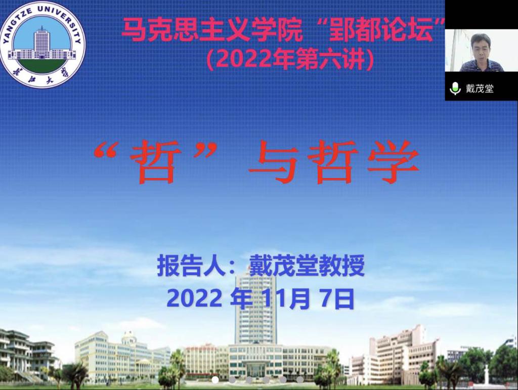 (通讯员:田语萱 谢蕾)2022年11月7日上午9:00-12:00,威廉williamhill“郢都论坛”2022年第六讲,在文科楼1104会议室和腾讯会议以线上线下相结合的方式同步举行。本次讲座的主讲嘉宾为北京师范大学哲学国际中心的戴茂堂教授,他以“‘哲’与哲学”为主题,深入浅出地解析了哲学的意涵,还原了哲学最本真的内容。讲座由学院副院长涂江波老师主持,学院100多位师生参与聆听。