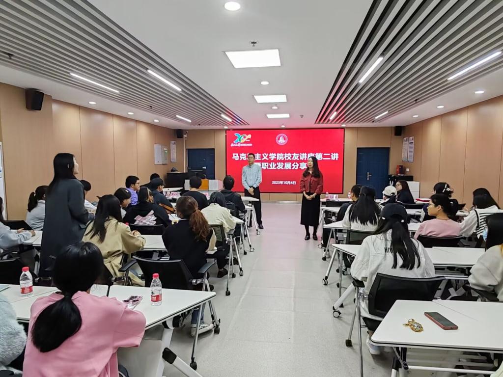 在随后开展的校友职业发展分享会上,吴云英畅谈了自己多年来在上海实习、就业、创业的成长感悟,并结合自身职业发展经历给同学们提出三点建议:一是要抓住机会,敢于去试、大胆去闯,大方自信地展示自己;二是要树立“利他”思维,帮助他人的同时帮助自己;三是要坚信“向外求得烦恼,向内求得幸福”,注重自身品德修养。她还结合典型案例分享了人际交往和求职面试技巧。育山(上海)教育科技有限公司总经理文伟校友聚焦“梦想、兴趣、动力”三个关键词讲述其创业体会,鼓励同学们培养兴趣、追求梦想、打造核心竞争力,在求学、求偶、求职过程中坚信“每天进步一点点,就能成为更好的自己”。在总结发言中,汤慧珍将两位校友的精彩分享浓缩为一个公式,即梦想+善学+修德=成功;她勉励同学们以学长学姐为榜样,志存高远、苦练本领、超越自我,学有所成,为学校增光、为人生添彩。