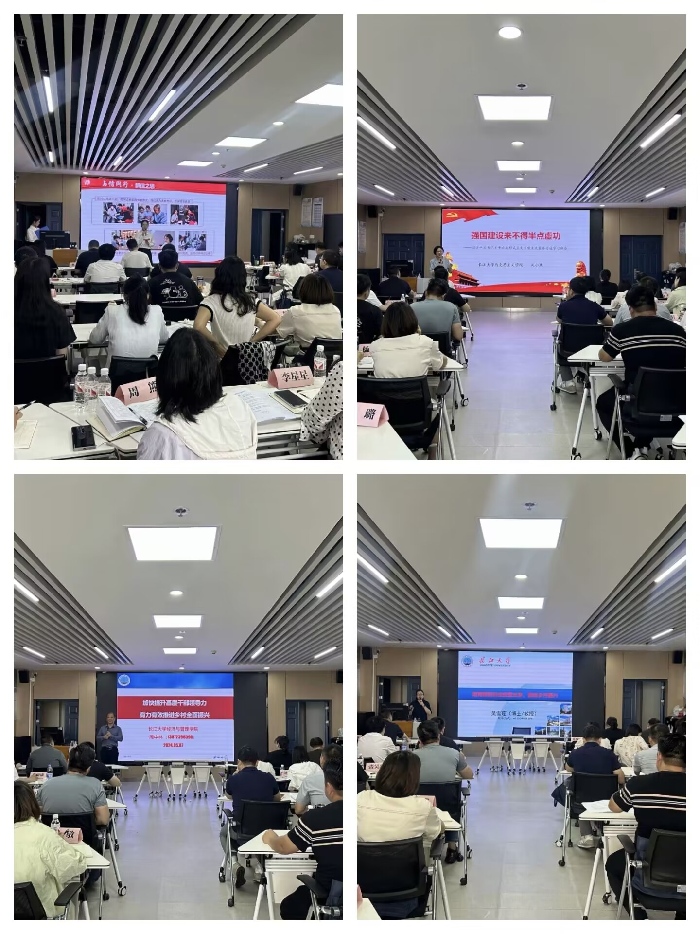 培训过程中,楚文化研究院教授徐文武以“传承荆楚文化,助力荆州复兴”为题、程坤书记以“领导干部心理调适与压力管理”为题、贾廷秀教授以“坚定文化自信,讲好中国故事”、经管学院吴雪莲教授以“培育新型农业经营主体 推进乡村振兴”为题、周中林教授的“管理沟通”、刘小燕书记以“强国建设从来不得半点虚功——习近平总书记关于力戒形式主义官僚主义论述学习体会”为题、梅平教授的“化工产业与环境保护”、姜学勤院长以“县域经济发展与突围”为题等为培训学员们带来了精彩的报告。荆州区经开区滩桥镇党委委员黄晨带来的“招商引资工作实务”以及湖北省共产党员英雄模范百封研究团队带来的情景教学互动教学:书信中的湖北精神特别让学员们印象深刻,沉浸式教学收获多感触深。