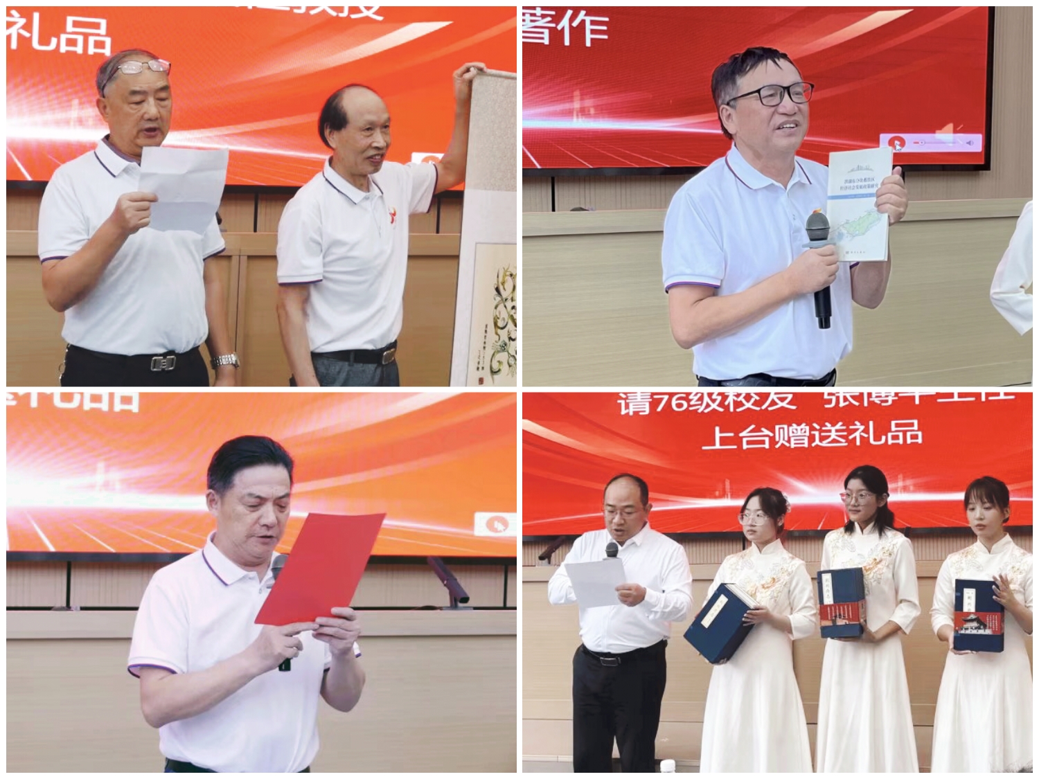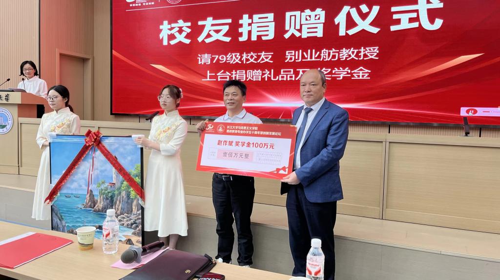 校友捐赠仪式将活动推向了高潮。蔡贤浩教授代表思政专业首届学生把当年读过的马列经典著作赠给了学院,徐时新教授和马敬桂教授还代表班级捐赠了一幅珍贵的楚绣,耗时一个月完成的非遗作品,传递了他们对母院真挚的情感;张博平、彭贤则等校友则代表思政专业76级、90级校友分别捐赠了明清时期的《荆州府志》和个人专著,他们希望思政学子学原著、读经典,做“学思践悟,知行合一”的时代新人;为奖励品学兼优、信念坚定的优秀学子完成学业,思政专业79级校友、武昌理工学院校长赵作斌捐资100万设立“赵作斌奖学金”。同为思政专业79级校友的别业舫代为捐赠了资金和画作,并诵读了赵校长的贺信,字里行间,满是校友对母校的牵挂与祝福,如春风化雨,润泽心田。