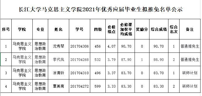 经学生本人申请、学院推免生遴选工作小组考核,现将我院2021届思想政治教育专业优秀应届本科毕业生免试攻读硕士学位研究生名单予以公示。公示时间:2020年9月24日-2019年9月25日,公示期间学生如有异议可向学院、教务处反映,如有违纪,可向学校纪委举报。联系电话:学院(0716)8060733,教务处(0716)8060580,学校纪委(0716)8060993。