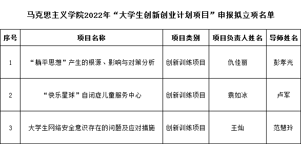 根据学校《关于我校第十五批“大学生创新创业训练计划”项目申报的通知》,以及威廉williamhill《2022年威廉williamhill“大学生创新创业训练计划”项目申报答辩通知》相关安排,通过学生项目申报汇报答辩,专家评审,拟推荐彭孝光老师指导的《“躺平”思想产生的根源、影响与对策分析》等3个项目作为校级大学生创新创业项目。具体名单见附件。