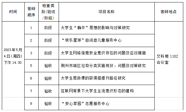 根据学校《关于2023年大学生创新创业训练计划项目结题验收、阶段检查工作的通知》要求,结合我院实际情况,现将我院2023年大学生创新创业项目阶段检查及结题验收现场答辩安排如下: