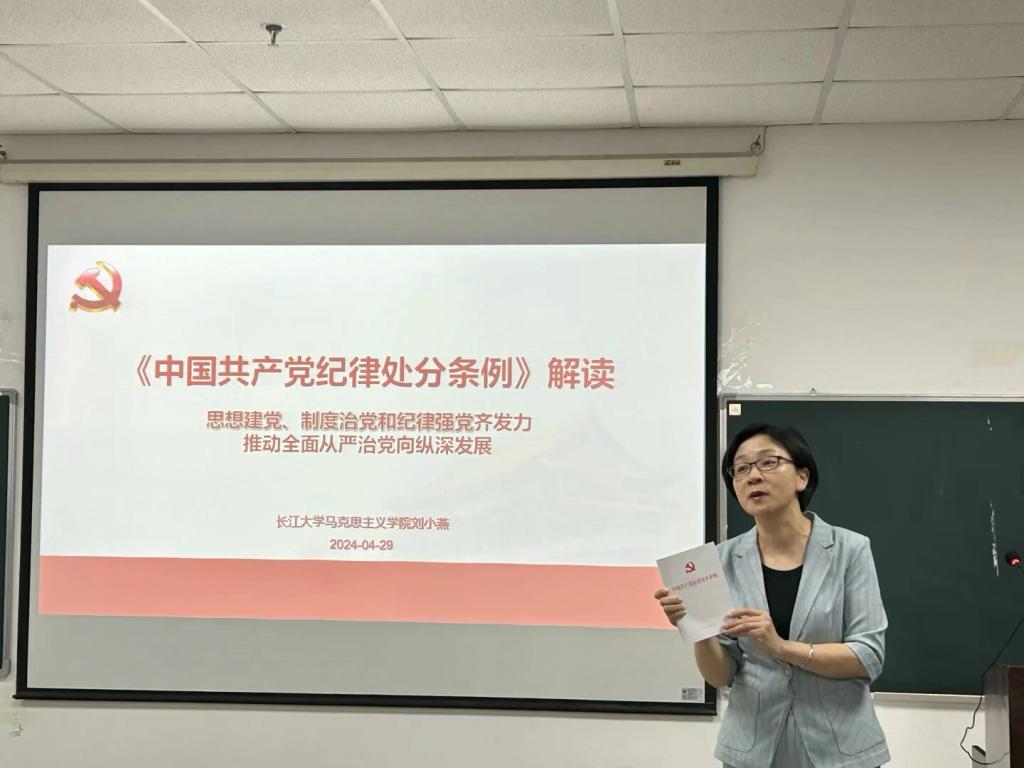 本次党课,刘书记围绕新修订的《中国共产党纪律处分条例》作解读。她从《条例》修订的背景和特点入手,阐释了《条例》修订的重大意义,逐句逐条领学了《条例》全文,并重点围绕党的政治纪律、组织纪律、廉洁纪律、群众纪律、工作纪律和生活纪律等六类纪律的106条负面清单进行详细解读,列举了生活中的案例便于理解。她希望同学们要原原本本学、结合实际学、带着问题学,真正领悟党纪学习教育目标要求,做到学纪、知纪、明纪、守纪,把遵规守纪刻印在心,内化为日用而不觉的言行准则。