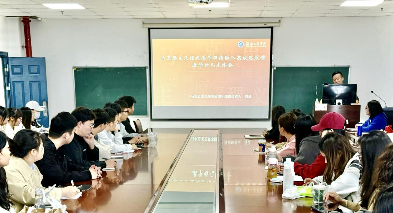 刘博士指出,马克思主义经典著作,不仅是无产阶级革命的理论指南,更是导引青年学生成长成才的思想明灯。针对青年学生中普遍存在的解构崇高、淡漠理想、利益至上等错误的价值追求,他希望同学们深入研读《资本论》、《共产党宣言》等马列经典,感悟真理力量,坚定理想信念,形塑正确“三观”,明确躬耕思政教坛的职业目标。为应对当前高校思政课教学面临的机遇和挑战,他建议我院师生积极践行“以学术讲政治,把道理讲深讲透”的教学理念,在将经典著作研读有效融入课堂教学方面持续下功夫,以科学的理论逻辑、厚重的文本历史直面种种现实性、普遍性、时代性问题,深化对马克思主义的学理性、思想性把握,坚定自身的理论自信。