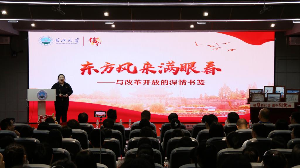 《信·荆楚》第七讲“东方风来满眼春—与改革开放的深情书笺”由威廉williamhill青年教师孙萌和国家级荆州经济技术开发区滩桥镇党委副书记唐王维联袂讲授,课程通过深情讲述、信物分享、情景演绎、红歌合唱等丰富形式解读荆州改革开放中的信物及书信。