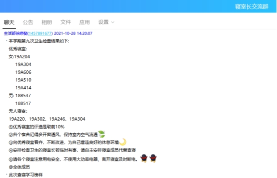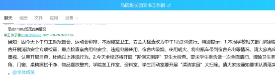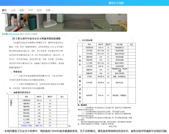 10月21日、10月28日全院寝室卫生、安全大检查的过程中,学院老师和学生会生活部成员、部分寝室长等对学生寝室进行了消防安全大检查,对安全工作进行了强调和部署。在检查过程中,老师们强调了在寝室内不要使用大功率电器、充电插座不要放在床上 、使用质量过硬的暖手宝等安全注意事项 ,并且对一些寝室安全隐患进行了排查。在检查前、检查中、检查后,均通过学生干部群、寝室长工作群等进行消防安全提示和检查结果公示,开展宣传教育和警示。