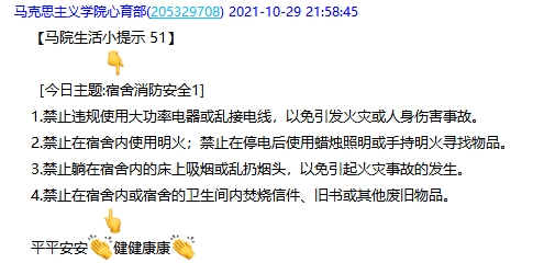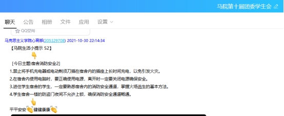 学院团委学生会通过QQ群等方式不定期开展线上消防安全小提示,教育引导全院学生重视消防安全,排查隐患。