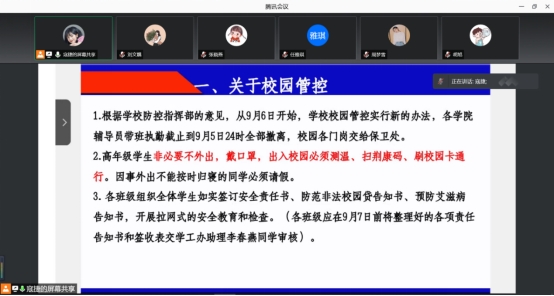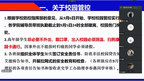 会上,各班班长主要从校园管控、新冠疫苗注射情况、反诈骗教育、疫情防控、线下教学等五方面强调了相关事项,督促学生每日自觉监测体温,如实填写体温自测表,并对高年级学生出入校园等管理事项、预防电信诈骗、线下教学课堂纪律和安全等相关规定提出了新要求。