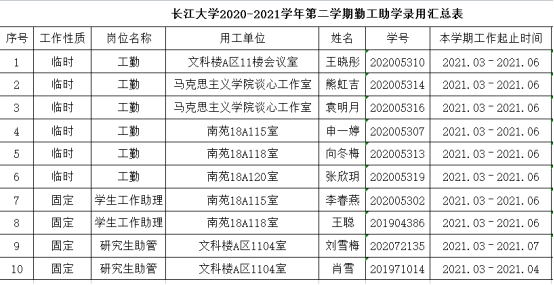 经学生本人申请,学院审核,现将我院2020-2021学年第二学期勤工助学拟录用名单公式如下: