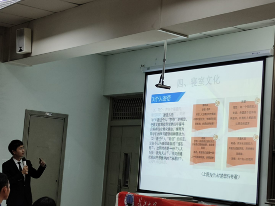 最后是由思政11801班李懿宸进行答辩。在他幽默风趣的介绍中,大家了解了这个有着强大凝聚力集体的创建背景、班级成员、班级特色文化、各项班级制度及学习风气。在班级风采展中体现出的班级平均绩点、四六级通过率、科研竞赛等成绩,更是认证了这个班集体的优秀与卓越。