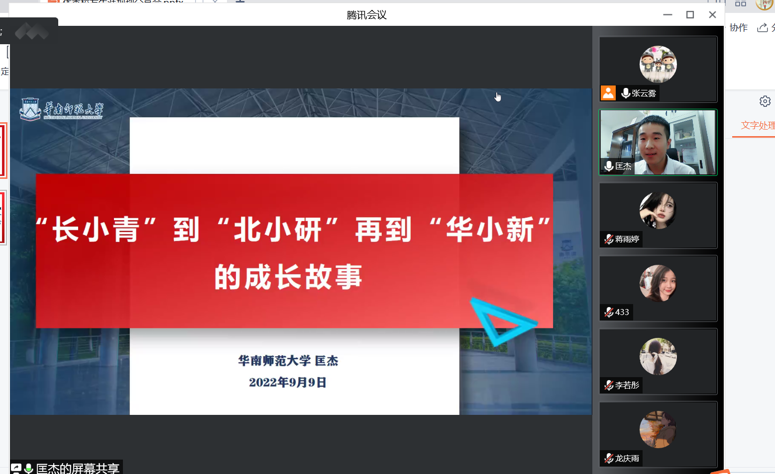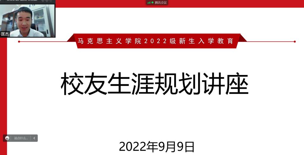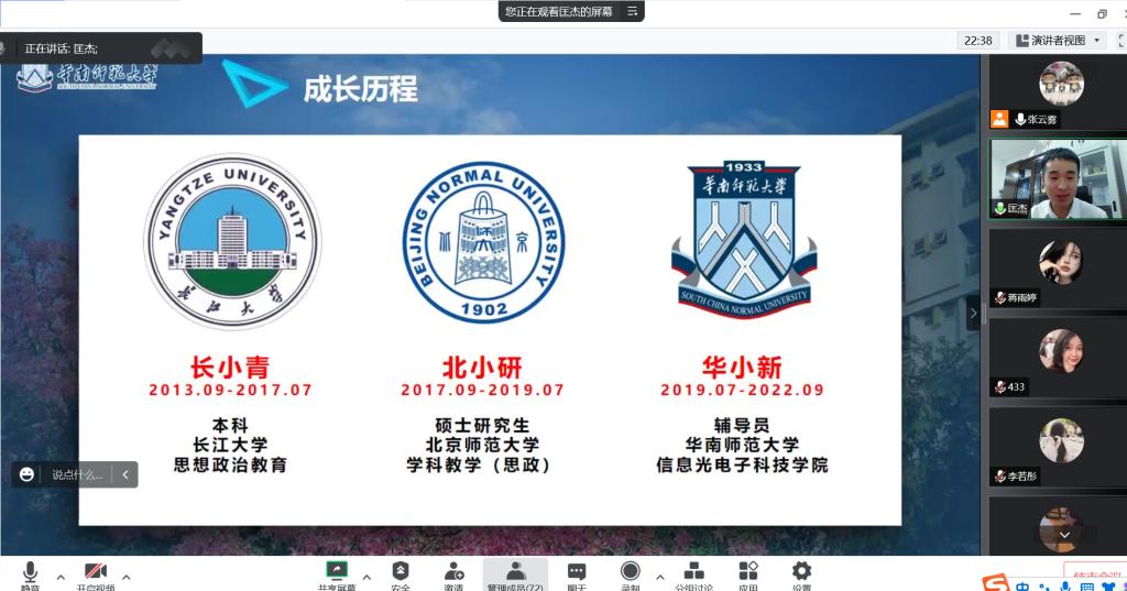9月9日晚,学院邀请了优秀校友匡杰老师为新生做生涯规划指导。匡杰为我院2017届本科毕业生,2017年至2019年就读于北京师范大学,现为华南师范大学信息光电子科技学院的辅导员。在一个半小时的交流中,匡老师分享了他从“长小青”到“北小研”再到“华小新”的成长故事。他以自身经历勉励新生要善于认识自我,及早定立目标,持之以恒努力,以更加昂扬的姿态融入大学生活,全力以赴向着自己的目标前进。听了他的分享后,新生还意犹未尽,纷纷在线提问,探寻学长成功的秘诀。