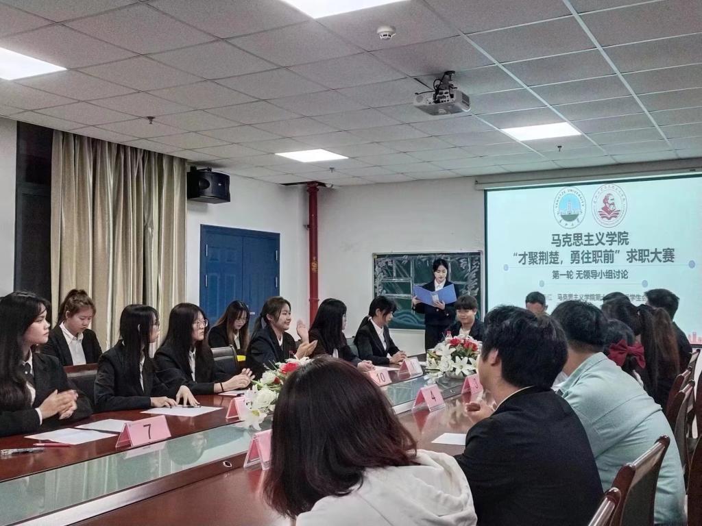 (通讯员 周芯如)为深入贯彻习近平总书记考察湖北重要讲话精神和省第十二次党代会精神,帮助大学生树立正确的择业观,提升求职能力,9月25日晚7时,威廉williamhill于文科楼1104室举办“才聚荆楚,勇往职前”求职大赛初赛。初赛以无领导小组讨论赛的形式选拔,就业专干李敏、团委学生会负责人王晓彤、郢都论坛负责人张李蔚、修远班负责人李周翊涵、慕晨辩论队负责人陈嘉锐任活动评委。