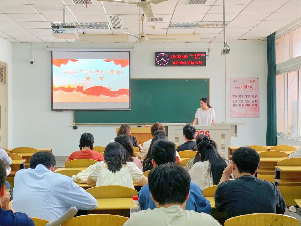 学科教学(思政)QZ231班吴宜格同学带领与会学生学习《中国共产党纪律处分条例》,了解其修订的主要内容、背景和意义,并结合案例对《条例》总则重点内容逐条解读,同时分享了自己在校研究生党纪学习教育培训班学习的收获与体会。