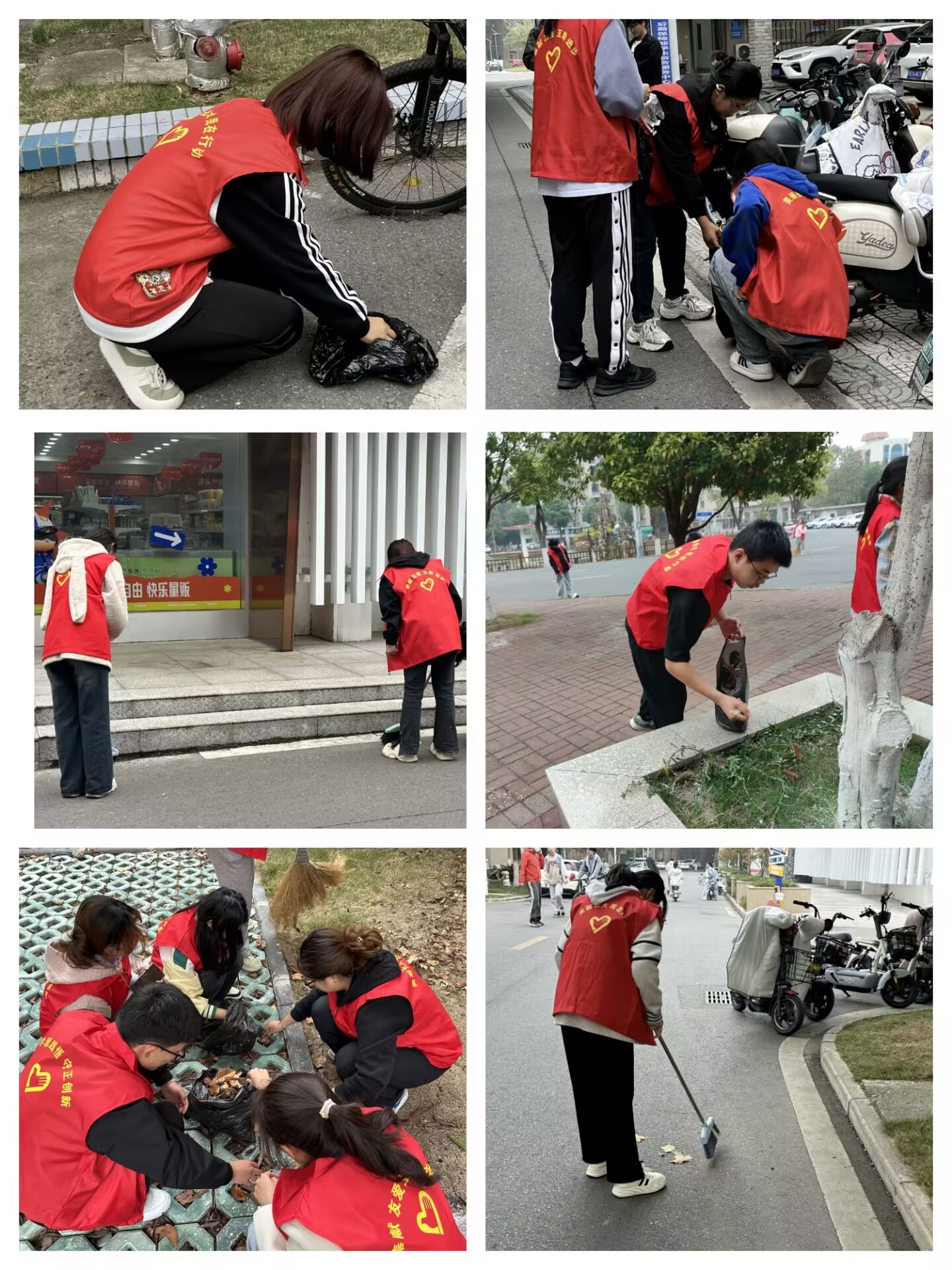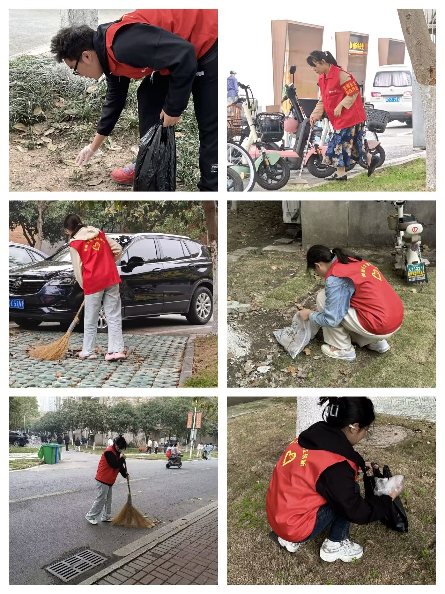 活动伊始,60余名学生分成了7个小组,依次划分了清洁区域。同学挥舞着扫帚,将尘土、落叶、烟蒂一一聚拢,动作利落;有的同学手提垃圾袋,细心捡拾沿途的废纸和落叶;还有的同学则将散乱的电动车和自行车排列得井井有条。不到一个小时,学院所负责的区域卫生面貌已焕然一新。