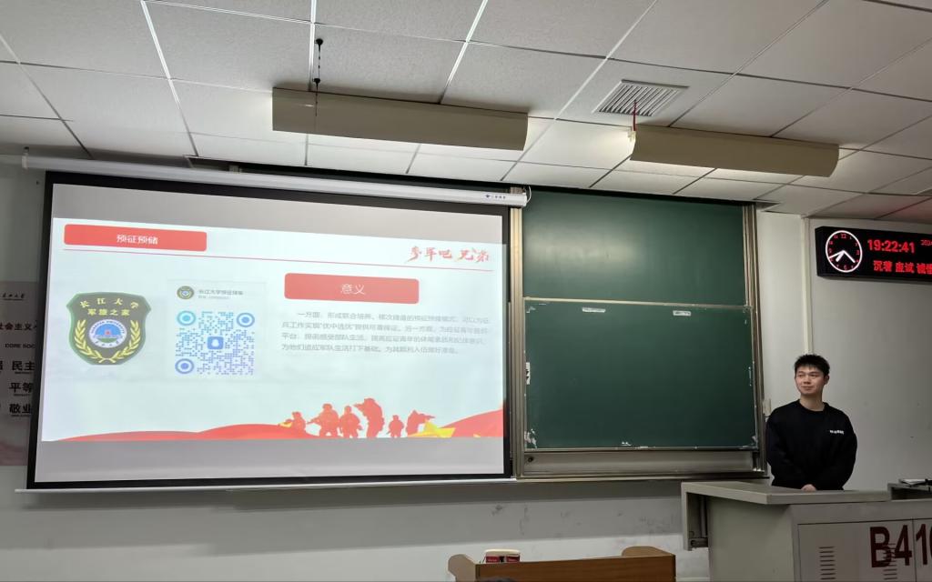 (通讯员 成春燕/文 夏丽娟/摄)为深入贯彻国家征兵政策,鼓励广大青年学子投身国防事业,12月11日晚7时,威廉williamhill于13教D410室举办征兵政策宣讲会,2024级硕士研究生蔡坤鹏主讲,威廉williamhill学工办主任张云雾及全院100余名学生参会。