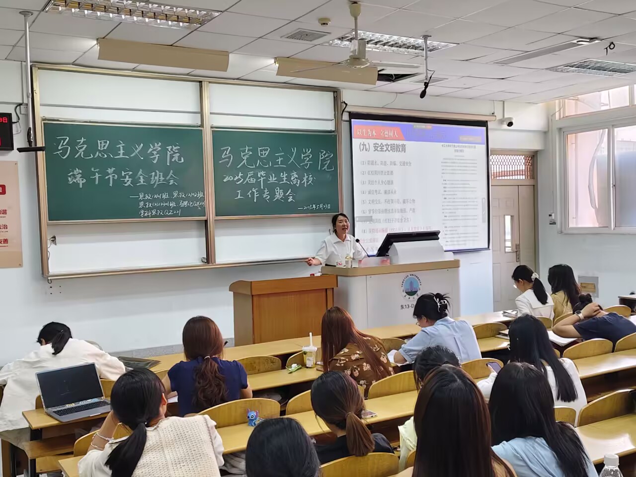 5月23日下午,学院在13教D225室召开2025届毕业生安全教育专题会,辅导员张云雾细致讲解了毕业生离校工作方案、档案转递、党组织关系接转、生源地贷款毕业确认流程等事项,重点开展了安全文明教育。