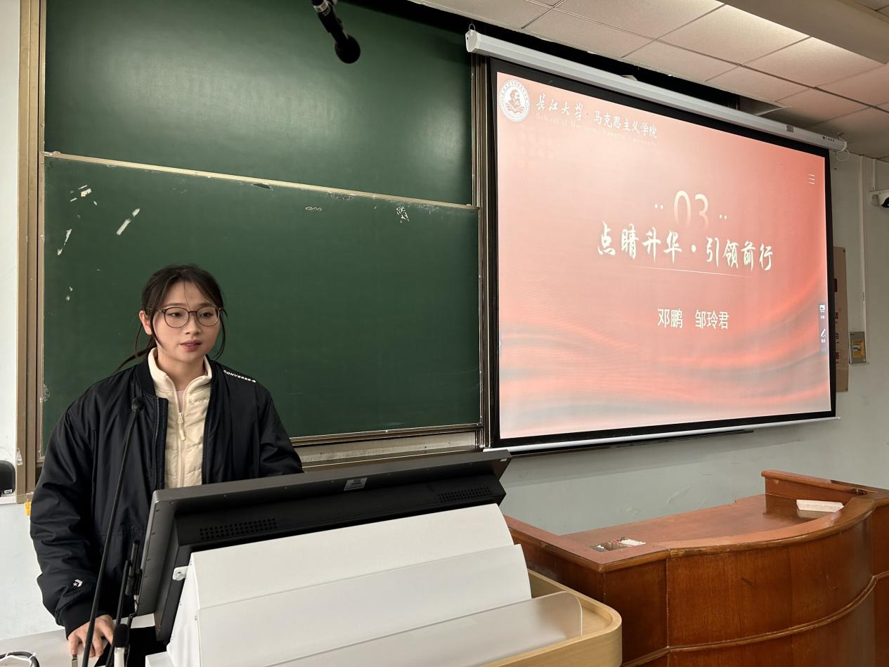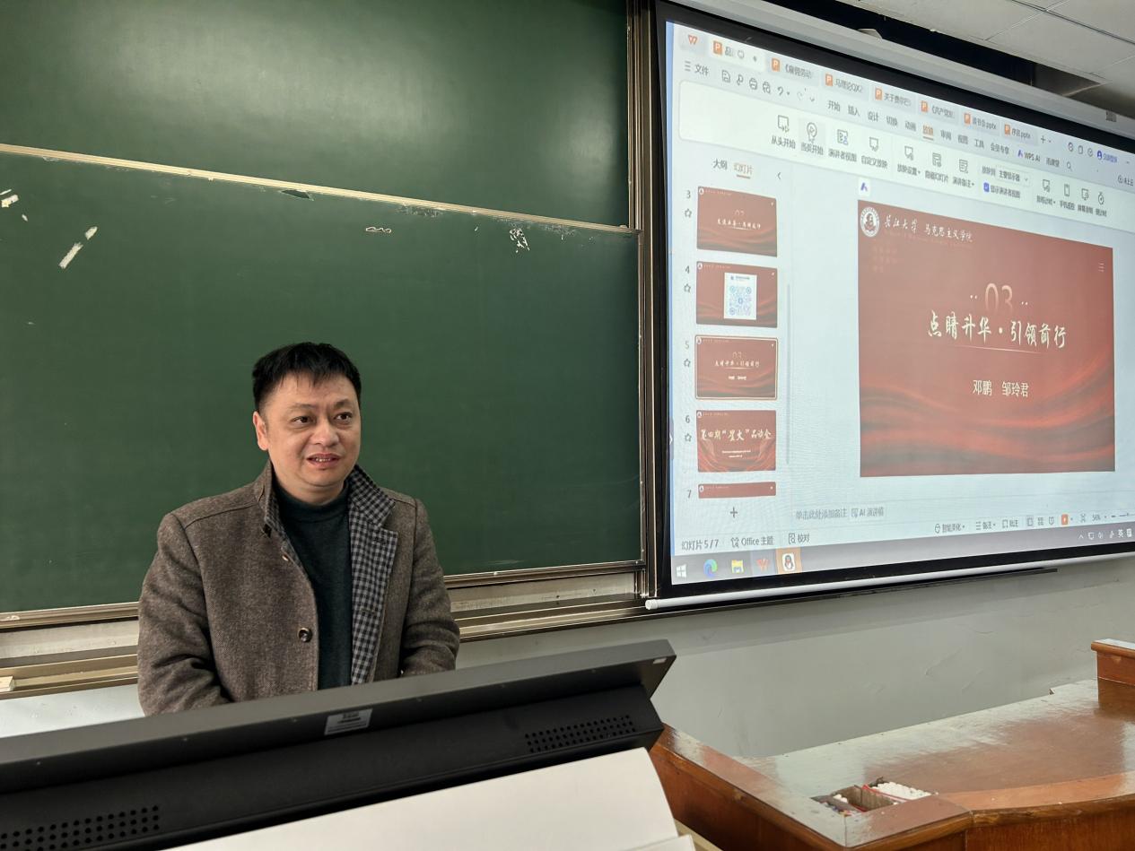 分享环节结束后,邓鹏老师与邹玲君同学依次对本次品读会进行点评。邓鹏老师强调,品读马克思主义经典著作,不仅是专业知识的汲取积累,更是思想境界的淬炼提升与精神世界的滋养丰盈,他勉励同学们在快节奏的学术研究与学习生活中沉下心来、潜心阅读,从经典著作中汲取智慧养分、筑牢理论根基,争做新时代不懈探索的思考者与勇毅前行的奋斗者。