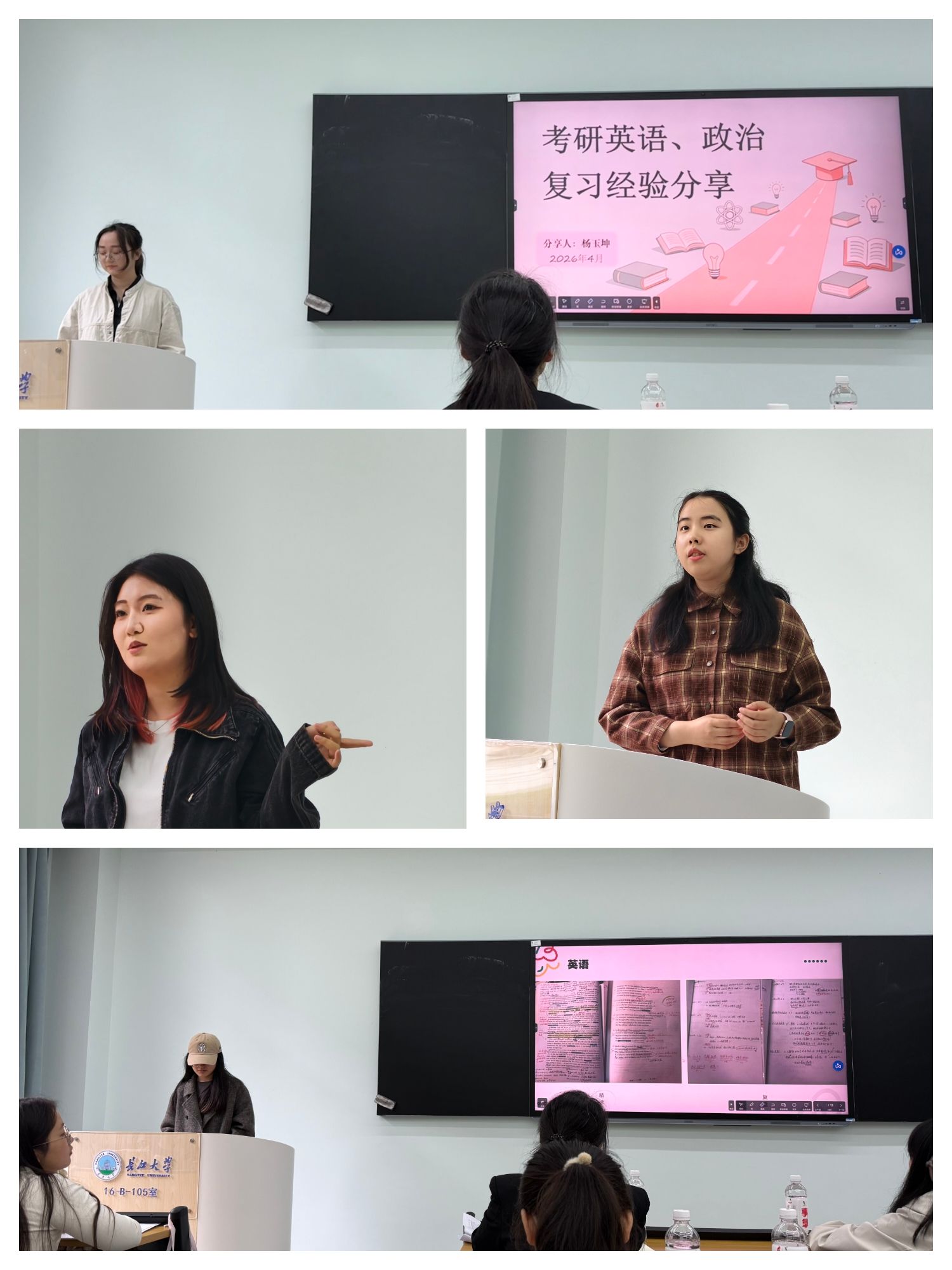 分享环节中,学生代表围绕推免准备、院校专业选择、复习规划、公共课与专业课技巧、心态调整等核心主题,结合自身备考经历,分享了实用、接地气的备考干货,为同学们提供了全方位的备考参考。同学们踊跃提问,现场交流氛围热烈融洽。