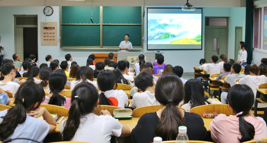 “人们都说‘滚滚长江东逝水’,但其实古地理长江并非如此。”在长江之水部分,朱业宏从地理的角度介绍长江地质板块的变化并引申至“人往高处走,水往低处流”的人生智慧。他借用左宗棠的名言告诫在场同学“择高处立、寻平处住、向宽处行”,理性地面对人生的各种状态。